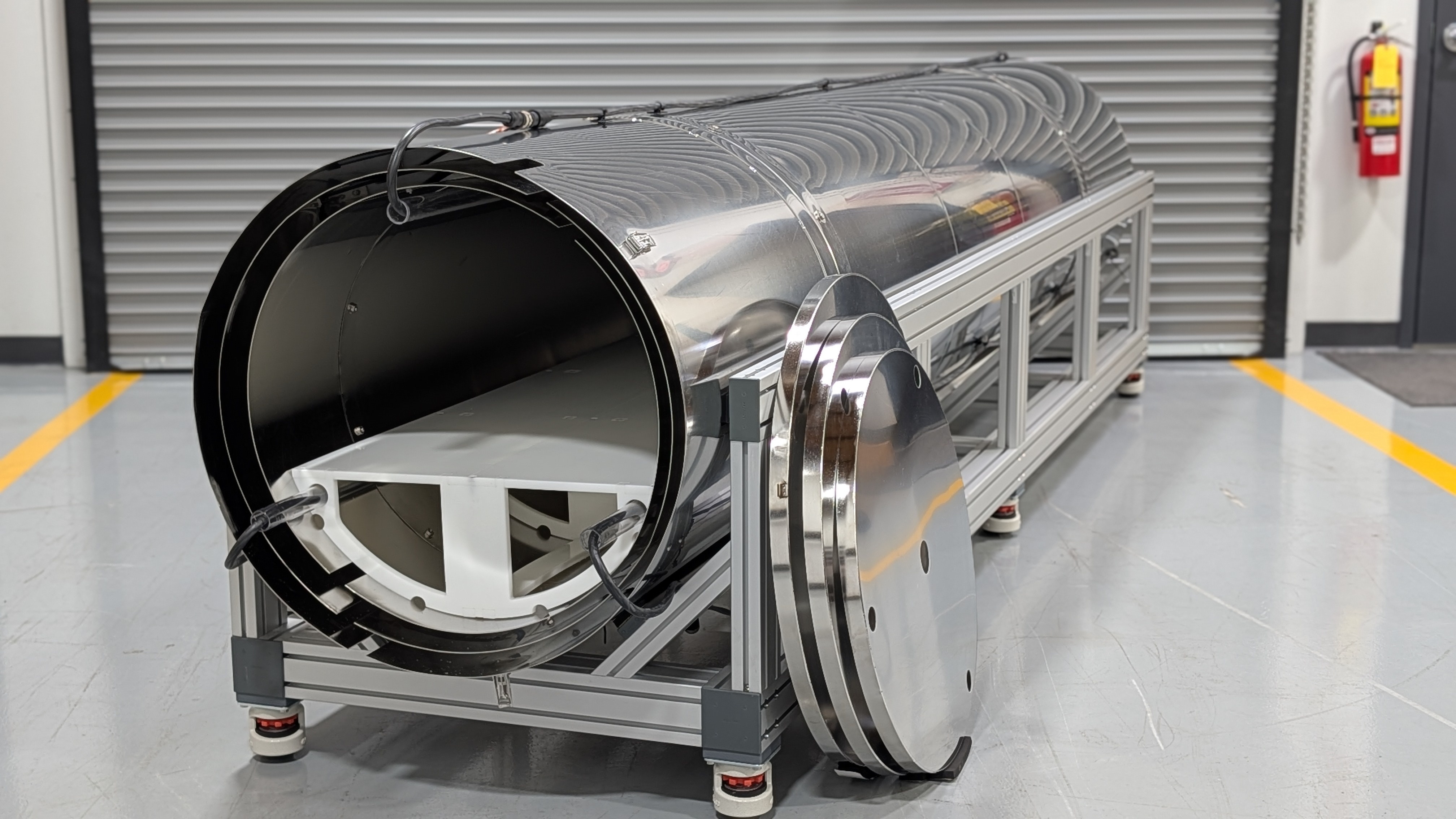 We have recently completed a 144" Long Zero Gauss Chamber with 25" Diameter for The University of Southern Mississippi’s (USM) Roger F. Wicker Center for Ocean Enterprise. The shield will be used for charatcerization and calibration of Uncrewed Underwater Vehicles (UUVs) and their magentic sensors for detecting underwater objects and hazzards. More Here. The three layer magnetic shield was capable of <1nT residual fields after degaussing the shield with the supplied degaussing equipment rack and software. The bulk of the shield construction is seamless, which allows for a small field graident of <2nT/foot in the central 120" Long region. Magnetic noise is less than 30 femtotesla per squareroot Hz.