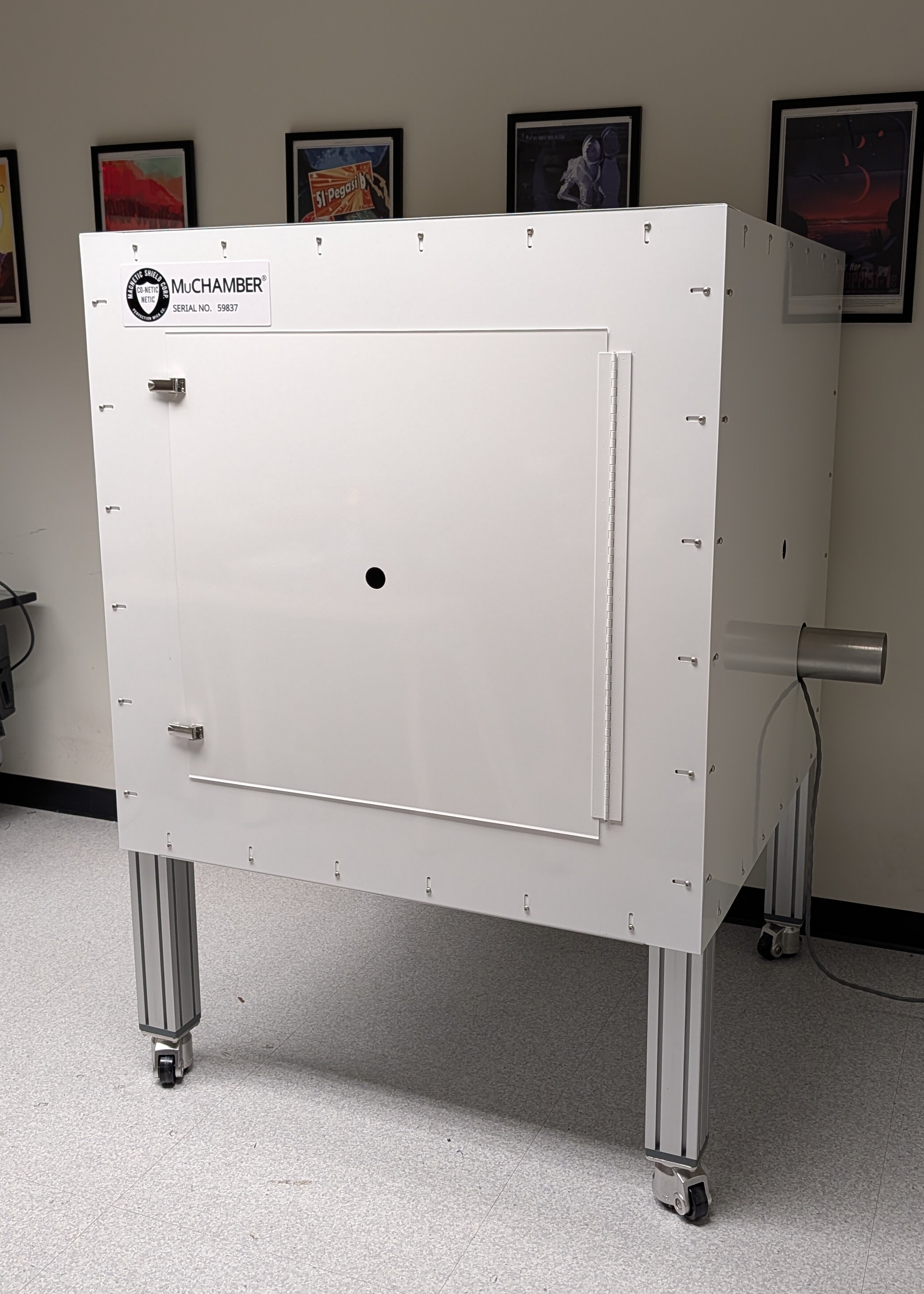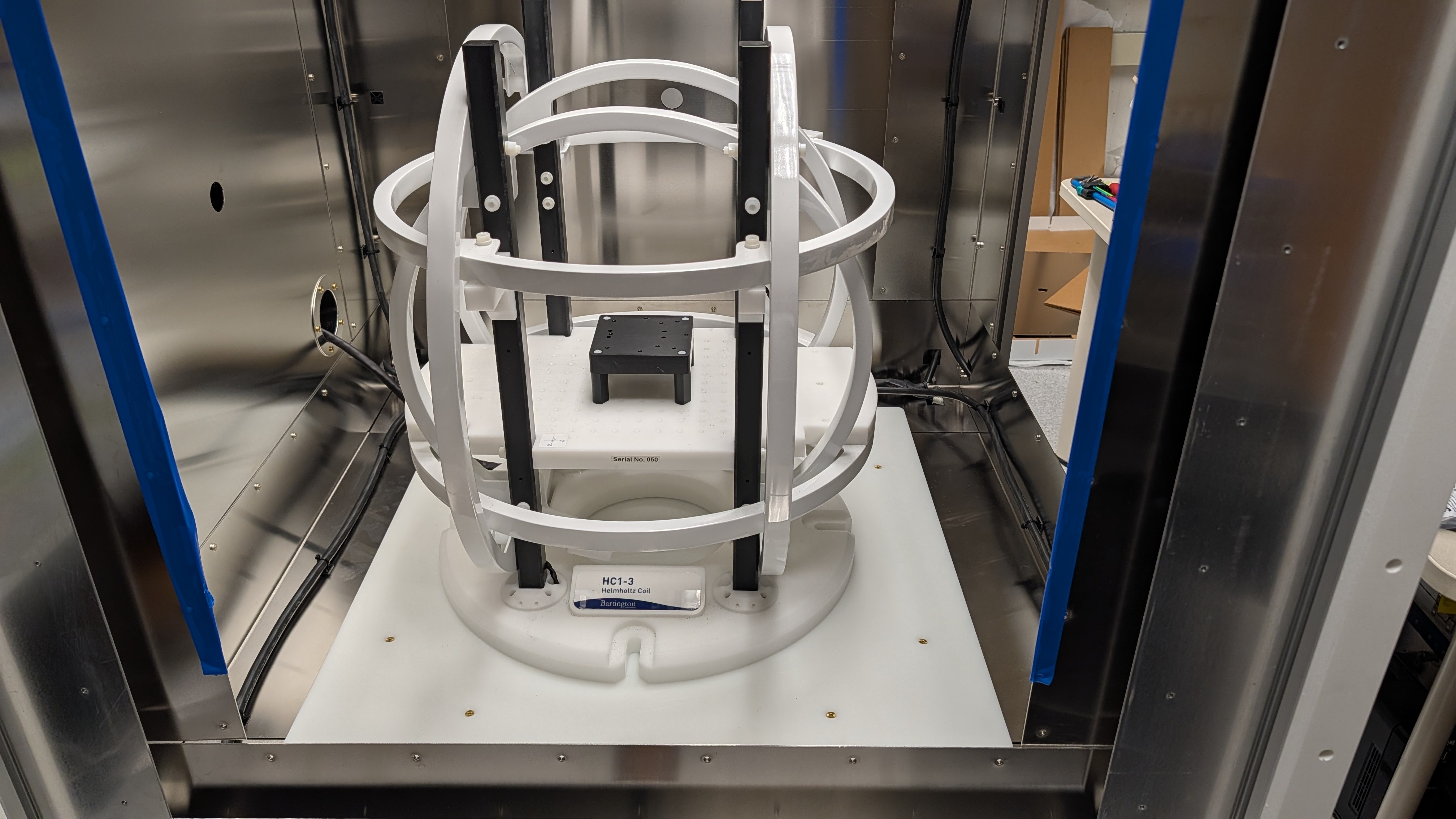 We completed the installation of a MuChamber in the Mag Lab of the Climate and Space Research Building at The University of Michigan in Ann Arbor. Dr. Moldwin's group is developing fluxgate sensors for cubesats used by NASA. The MuChamber provides them with a low noise enviroment to house their 3-axis Bartington HC1 Helmholtz coil. The chamber includes a degaussing coil to help keep the resisdual fields low.
